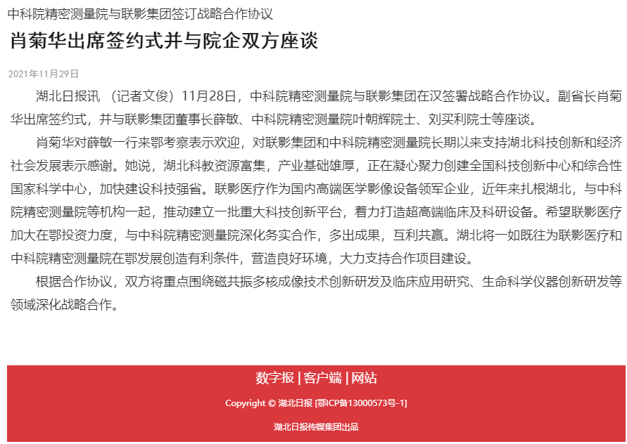 【湖北日报】中科院evo视讯官网与联影集团签订战略合作协议 肖菊华出席签约式并与院企双方座谈
