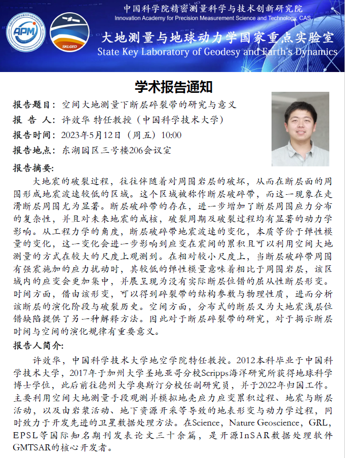 2023年5月12日大地测量与地球动力学国家重点实验室学术预告