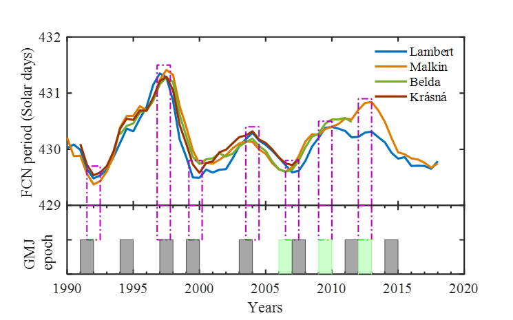 地球液核自由章动周期变化(实线)和地磁急变(阴影)