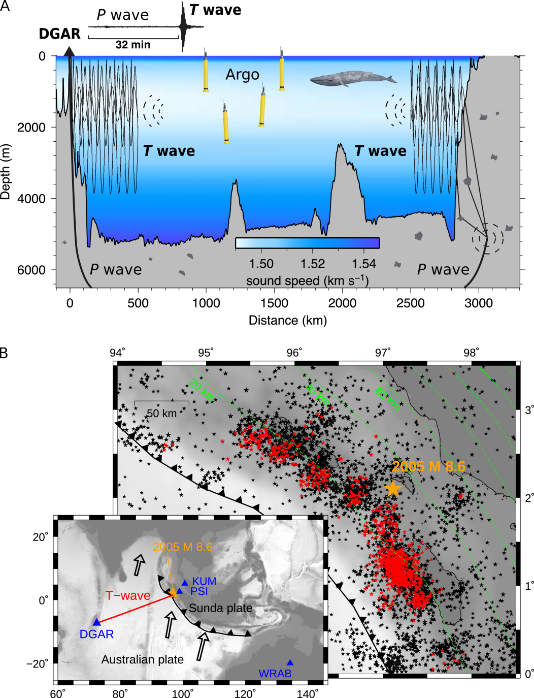 地震T波是海区地震激发的弹性波在海底转换而成的水声波,可以在海洋SOFAR通道中长距离传播,其传播时间可以敏感地反映海水声速,从而用于可靠地反演海水温度变化。该地震学团队在2004年印尼大地震之后,召开了地震T波、定点持续噪声源、地震背景噪声等与海洋有关的研究。该团队对苏门答腊地区的大量地震波形进行了分析,发现了丰富的重复地震事件。在此基础上,他们准确测量了一系列重复地震的T波到时微弱变化,重构了2005-2016年期间T波到时变化的时间序列;基于先进的地震波传播算法,计算得到了T波对海水温度变化的敏感核函数,对比已有物理海洋学的观测与大洋环流模式,验证了该方法的可靠性,并取得了赤道东印度洋深层海水温度随时间变化的特征。该项研究揭示了赤道东印度洋的深层海水温度存在准双周、半年和年周期等变化,而且新方法测量得到的温度存在十年的线性增长趋势,明显高于以前的研究结果。该方法可以利用已经积累的大量T波资料,取得过去几十年大洋深处海水温度变化特征,从而为全球气候变化研究给予新手段。