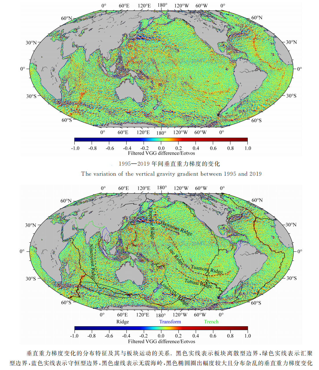 海洋大地测量与水下导航研究团队提出利用高精度、高分辨率的测高重力场,构建海洋时变重力场,并根据质量迁移与地球外部重力场变化的对应关系,研究深海构造运动。利用不同时期测高资料推算1995-2019全球海洋重力场变化结果,反演分析全球洋底板块运动特征。研究发现,板块汇聚边界、板块内无震海岭、海山群、断裂带等区域重力异常变化显著,而在板块离散边界无明显变化趋势;西南印度洋中脊、大西洋中脊、中印度洋中脊等地区重力异常垂直梯度变化显著,在西太平洋俯冲带、部分海岭区域也存在明显变化,其空间分布与海底地形基本吻合。海洋重力场变化整体上准确反映了全球洋底板块构造运动,相较于重力异常变化反演结果,重力垂直梯度的变化能够更为准确地反映洋底板块运动特征,特别是在洋中脊区域,扩张速率越小,垂直重力梯度变化越显著。