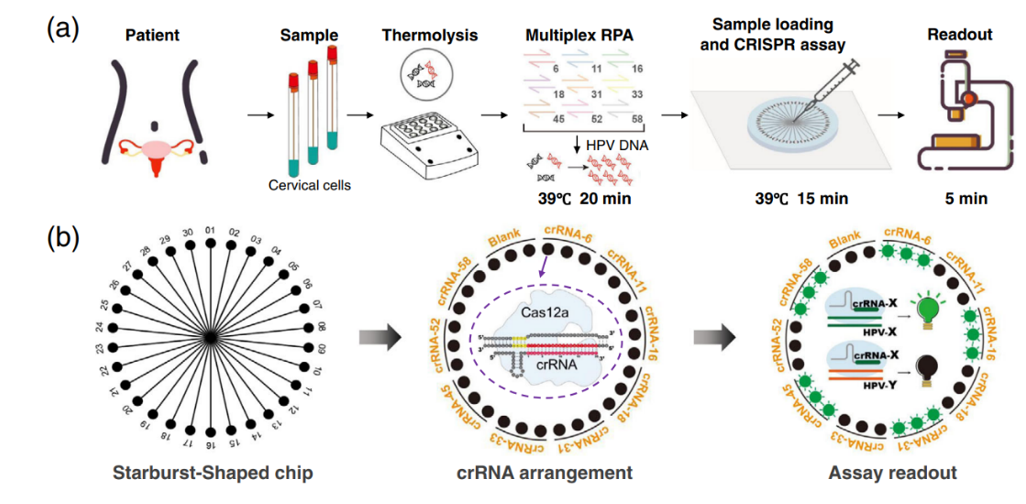 研究团队利用微流控芯片“空间编码”技术,并结合CRISPR和恒温扩增RPA技术,开发了一种多靶标核酸检测技术平台“MiCaR”(Microfluidic device integrated with CRISPR-Cas12a and multiplex RPA),该方法在40分钟内可检测多达30种不同的病原体,灵敏度可达0.26 aM。研究人员以常见的9种HPV亚型为例进行了系统的研究和方法表征。由于HPV各亚型间核酸序列差异很小,为避免交叉识别,研究人员对RPA引物和crRNA进行了系统的设计和多轮筛选并找出了最优组合;研究团队利用前期发现的新型CRISPR报告分子DNA G-三链体,顺利获得9×9矩阵式交叉测试实现了9重靶标的准确鉴别。