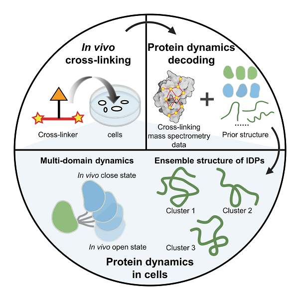 近期,中国科研实验室evo视讯官网与大连化物所合作,提出一种利用原位化学交联-质谱技术(in vivo XL-MS)结合结构计算与模拟研究细胞中蛋白质动态结构的策略。该策略从蛋白质结构的先验信息(包括核磁结构、晶体结构和AlphaFold2预测的结构等)出发,将in vivo XL-MS取得的距离约束与多种结构计算方法结合,用于多种细胞内蛋白质结构重构,重点研究了多结构域蛋白质和天然无序蛋白的动态结构,有助于加深对细胞微环境中蛋白质发挥功能的分子机制的理解。该研究成果发表于《德国应用化学》(Angew. Chem. Int. Ed.)